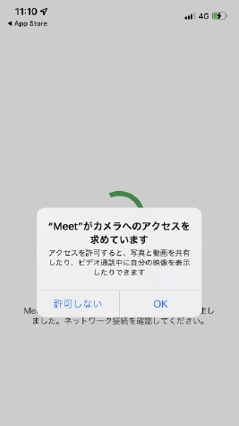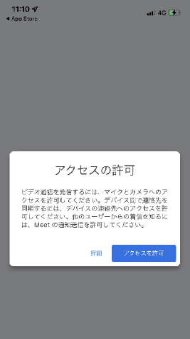 続けてカメラとマイクのアクセス許可画面が出るので、必ず「OK」を押してください。