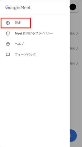 「Meet」を起動し画面上部の赤枠のメニューボタンを選択。